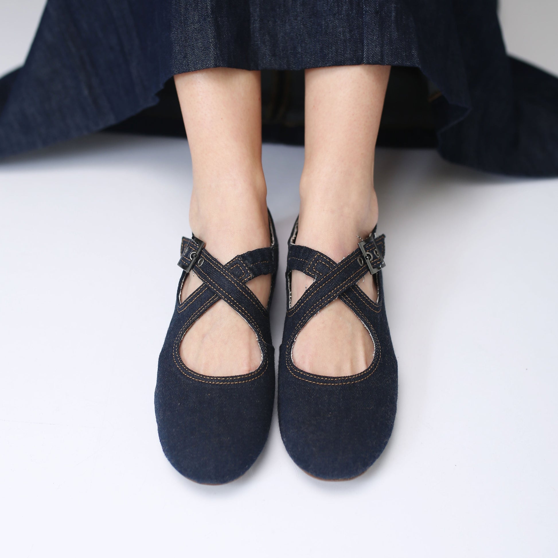 Balerinas en tela de jean. Correas cruzadas con hebilla color plata quemada. Plantilla de jean. Suela de caucho.