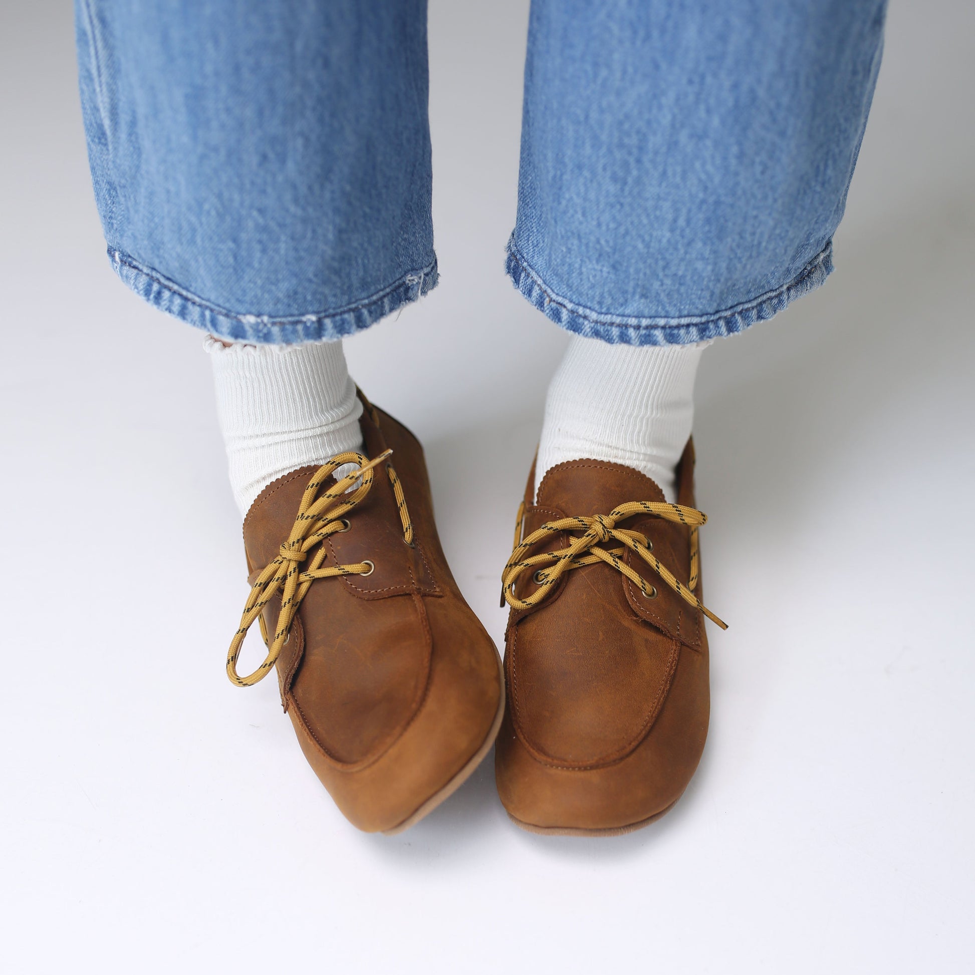Mocasin estilo náutico o Top Sider de cuero liso marrón. Pasador ajustable. Interior de cuero natural. Suela de caucho crema.