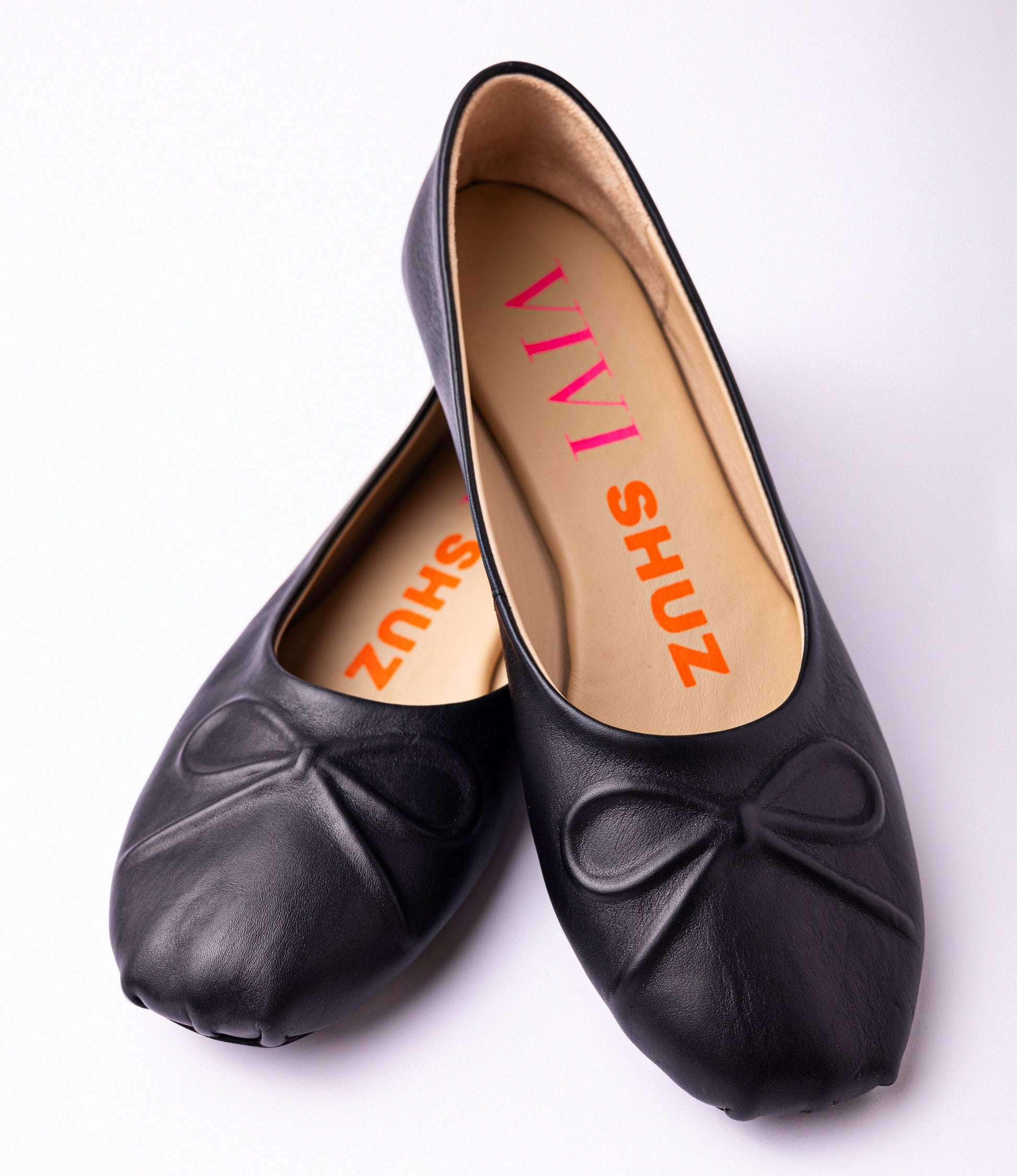 Balerinas en cuero liso negro. Detalle de lazo interno moldeado en el cuero. Forro en cuero negro. Punta cuadrada con detalle de pliegues. Suela de caucho negra.