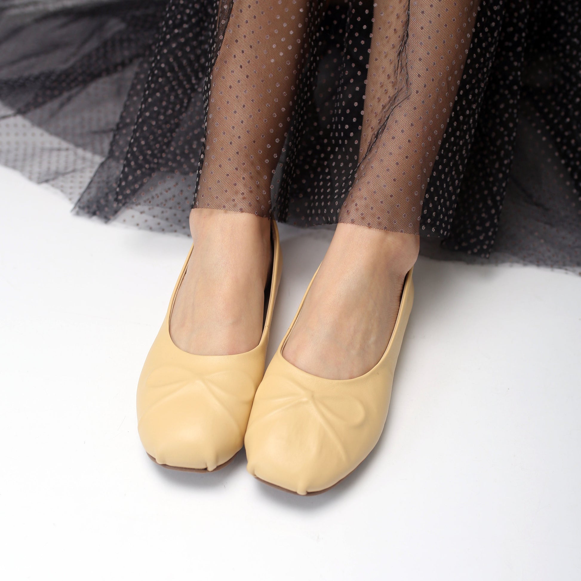 Balerinas en cuero liso amarillo manteca. Detalle de lazo interno moldeado en el cuero. Forro en cuero natural. Punta cuadrada con detalle de pliegues. Suela de caucho crema.